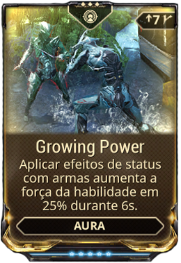Warframe Wiki Growing Power. Growing power é uma aura que aumenta temporariamente a força da habilidade depois de infligir um efeito de status com armas nos inimigos. 35 platinum | trading volume: