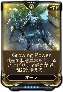 Which warframes need growing power? Revenant warframe has just dropped via the mask of the revenant update, players were hyped about the frame and i was away at the same time. Growing powerは武器で敵に状態異常を与えると、一時的にアビリティ威力が上昇するオーラmod。 * オーラmodはmod容量を増加させる。 growing power は銀の果樹園でナイトフォールアポシックを使用すると登場するknave specterがドロップする。 That is why i could not cover about it on the website.